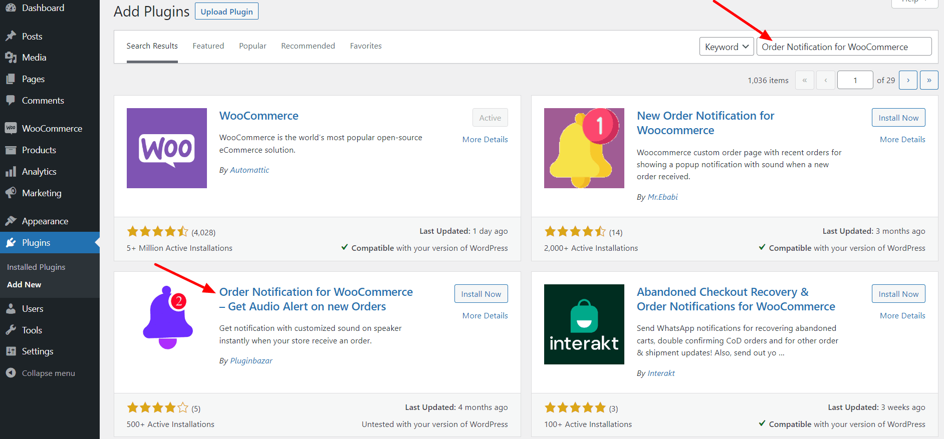 Go to your website’s dashboard to install Order Notification for WooCommerce from the plugin directory. Then, navigate to Plugin and click on Add New. After that, type “order notification for WooCommerce.”